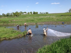 The U. S. Fish and Wildlife Service has seined the oxbow twice in the last several years. They found more than 15 different kinds of fish, including the Topeka Shiner that is an indicator species for a healthy stream environment. The diversity in the fish population was mirrored in the diversity of the last team that did the sampling: there was only one “token” guy in the group of five or six biologists.