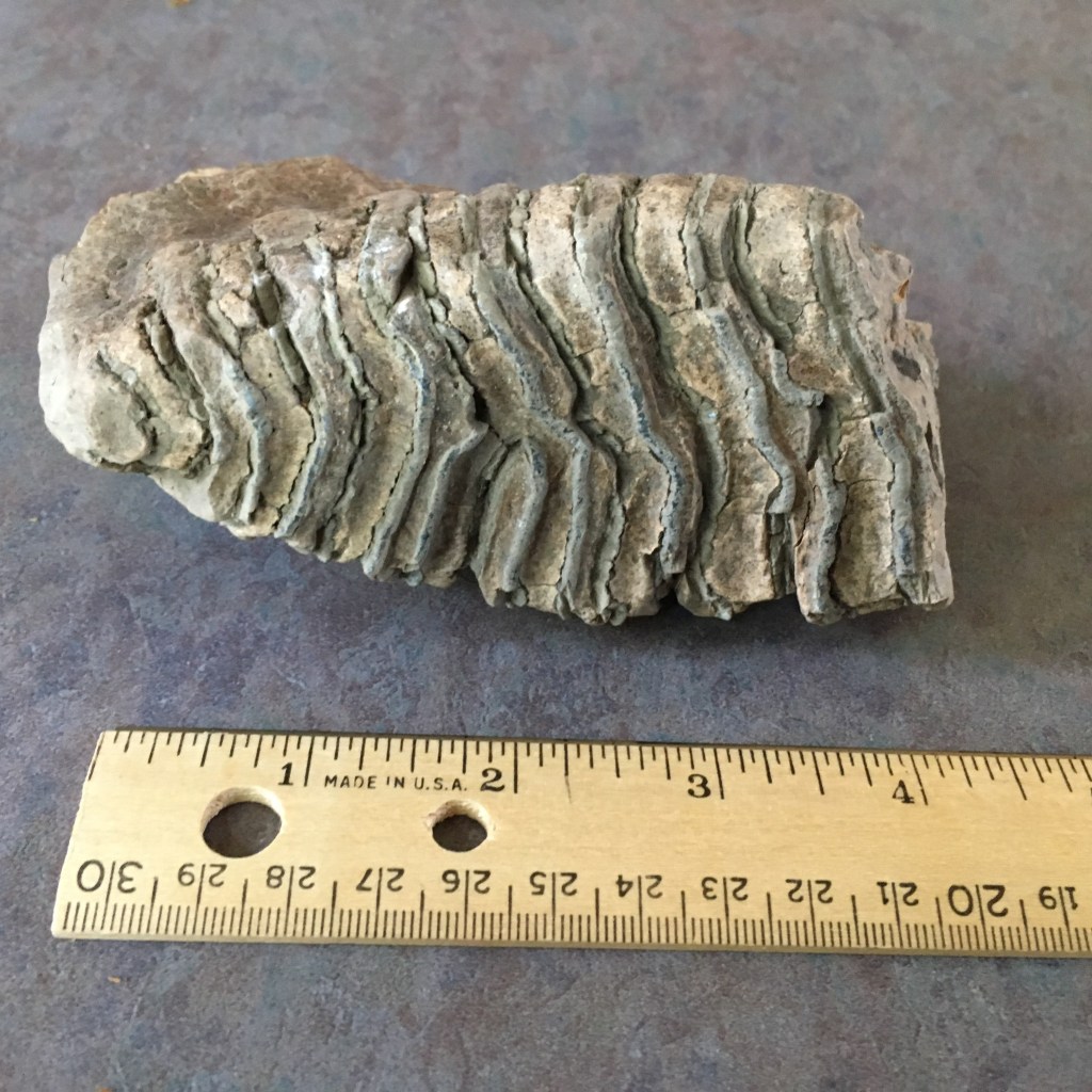 The tooth on the left is from the Farm. Dr. Mead described it as a lower tooth from a young Columbian mammoth. The teeth in the right are still in place in the excavations at the Mammoth Site. The flat ridges on mammoth teeth are designed to grind up grass in contrast to the conical ridges on mastodon teeth that were more effective for browsing twigs on trees and shrubs. There are no mastodons at the Mammoth Site. Last week I incorrectly said that our tooth is from a wooly mammoth, but there’s a big difference in size and population. For example, the Mammoth Site has the remains of 56 Columbian mammoths, but only 4 wooly mammoths.