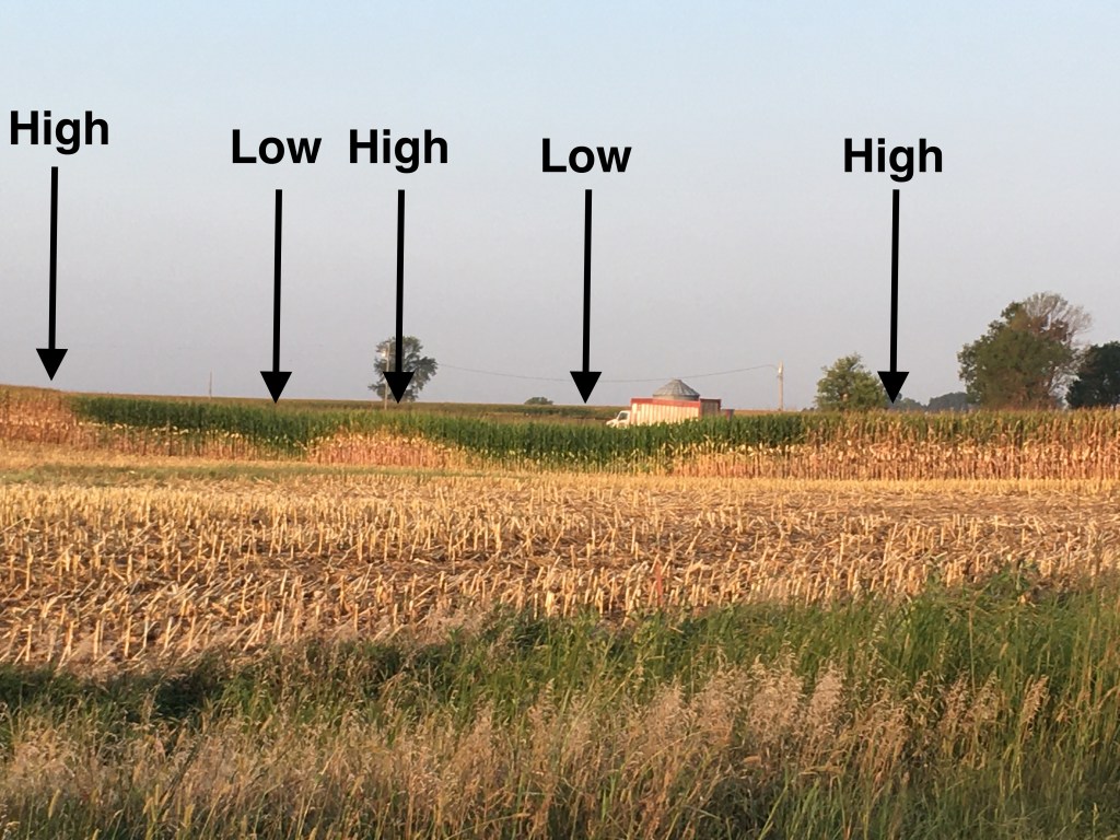 This past week a lot of the corn in our neighborhood was chopped for silage. This photo shows a “wall” of corn that illustrates the influence of subtle micro landforms in a floodplain setting. Green stalks mark wetter topographic low spots and brown ripe stalks spread over the subtle adjacent high spots. It’s a pattern that’s also seen in the brome and blue grass pasture.