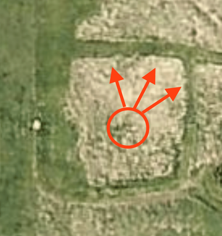 We’ve got about a dozen patches of native prairie marked by big bluestem as the main indicator plant. The August 5 post linked here describes four of them. Among the dozen prairie patches, two are warm-season plantings, but the others are from preserved indigenous seed banks. Most locations are in areas where the stand of brome is thin, like obvious west-facing hill slopes. But, other locations seem to be associated with subtle small-scale topographic features. In this post we’ll relate a cluster of three prairie patches (circled in blue) to slight topographic highs and propose an experiment on a planted prairie patch (circled in red).