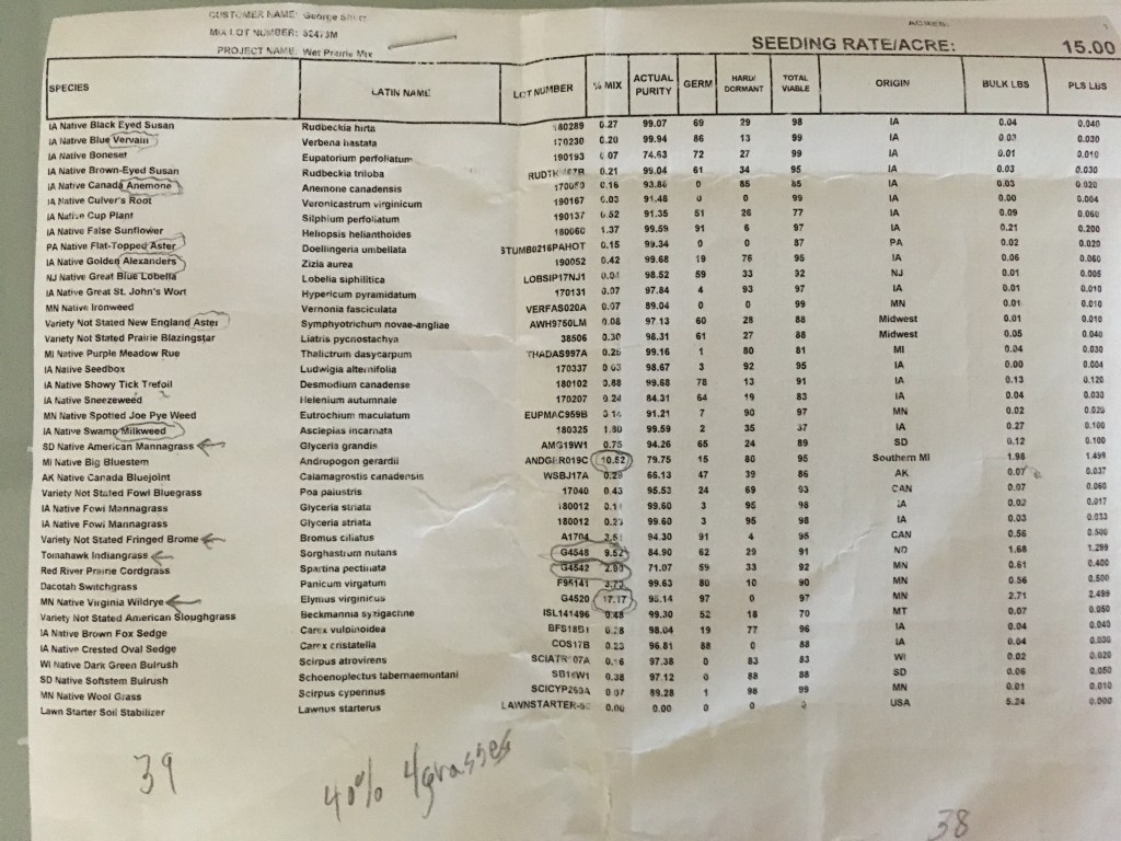 We do have paddocks seeded to warm season grasses, but we’d like to diversify some areas from dominant brome to include native cool season grasses and other native plants. This is the seed tag from a commercial mix that I tried to frost seed by hand earlier this year. It would provide diversity because it had dominantly wild rye in it’s four main grasses plus about forty other species, including half a dozen plants that are found on one of the native prairie remnants that we’ve identified in the pasture. Problem is, it’s hard to see that anything really grew in part because a lot of the species are not easy to identify….at least for me. Also, I just had to take what was available in the commercial mix that only had a few species overlapping with the native plants we knew grew in the pasture.