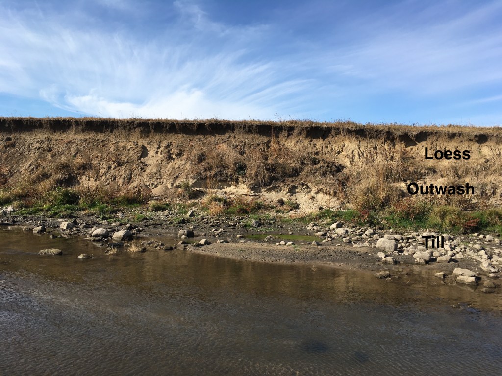 Where the main channel of the Creek gets close to the terrace, it erodes into the steep bank to give us a view of the geologic layers. The aquifer is sandwiched between the overlying wind-blown loess and the underlying glacial till. Black soil is developed at the top of the buff-colored loess and the light colored sand and gravel outwash lies on top of the glacial till.