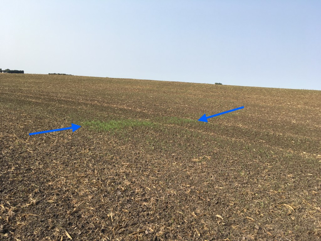 This cartoon is modified from last week’s post that introduced the ideas about underground water stored in aquifers on the Farm. The layer of fractured till is sandwiched between windblown silt and unfractured till in the hills and uplands that surround the Creek valley. Groundwater moves through fractured till and leaks out onto the surface as springs and seeps. The photo on the right is of a hill slope with newly planted cover crop. The first green whiskers of rye grass are growing in a linear pattern that probably reflects a particularly “leaky” fracture.