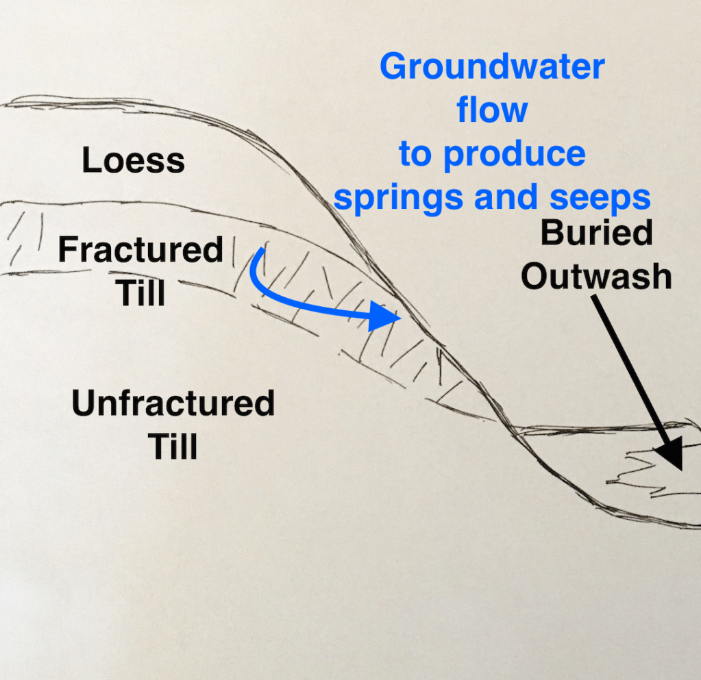 These near-surface aquifers like fractured clay till and like the terrace outwash described last week are easier to visualize and we can actually see the results of them leaking water out onto the land surface. In contrast, the outwash sand and gravel buried under the Creek’s floodplain are more subtle and open to interpretation. We’ll tackle that buried aquifer in next week’s post.