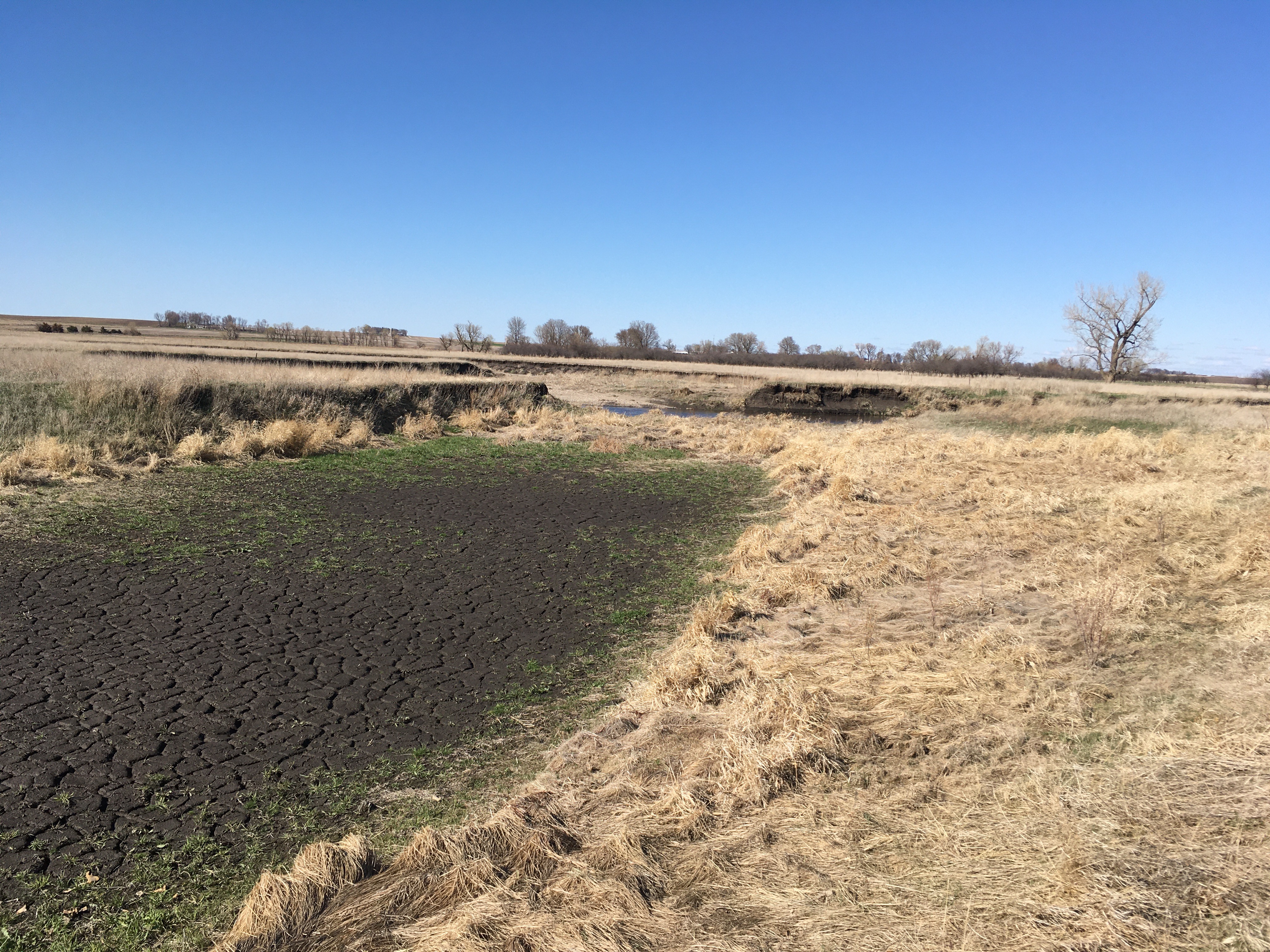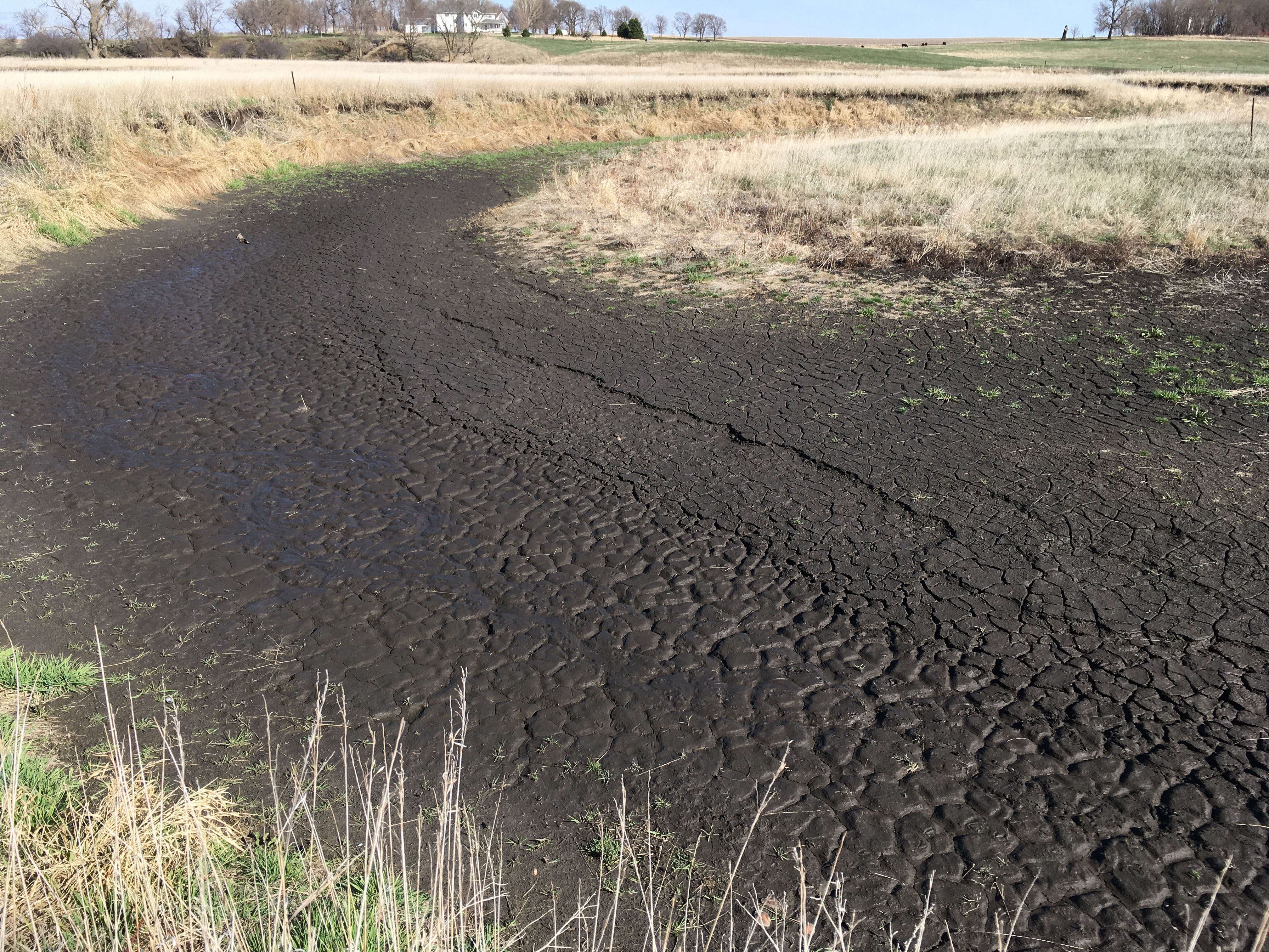The oxbow has a series of specific parts that we’re going to tour through to show the latest changes. The “upstream plug” is sediment deposited when water from the channel flows into the meander. It’s gotten to be so high that plants have established a footing. Last year’s brown grass now extends across the mouth of the oxbow and this season’s new green vegetation is starting to grow out into the mud flat. Looking the other direction into the wetland, it’s all dried up wetland bottom with mud cracks where there used to be water. The area of brown grass in the middle was an “island” last year and this is the area where rare cricket frogs and Topeka Shiners hung out. There’s no place for them this year unless water levels come up a lot and the oxbow is flooded again.
