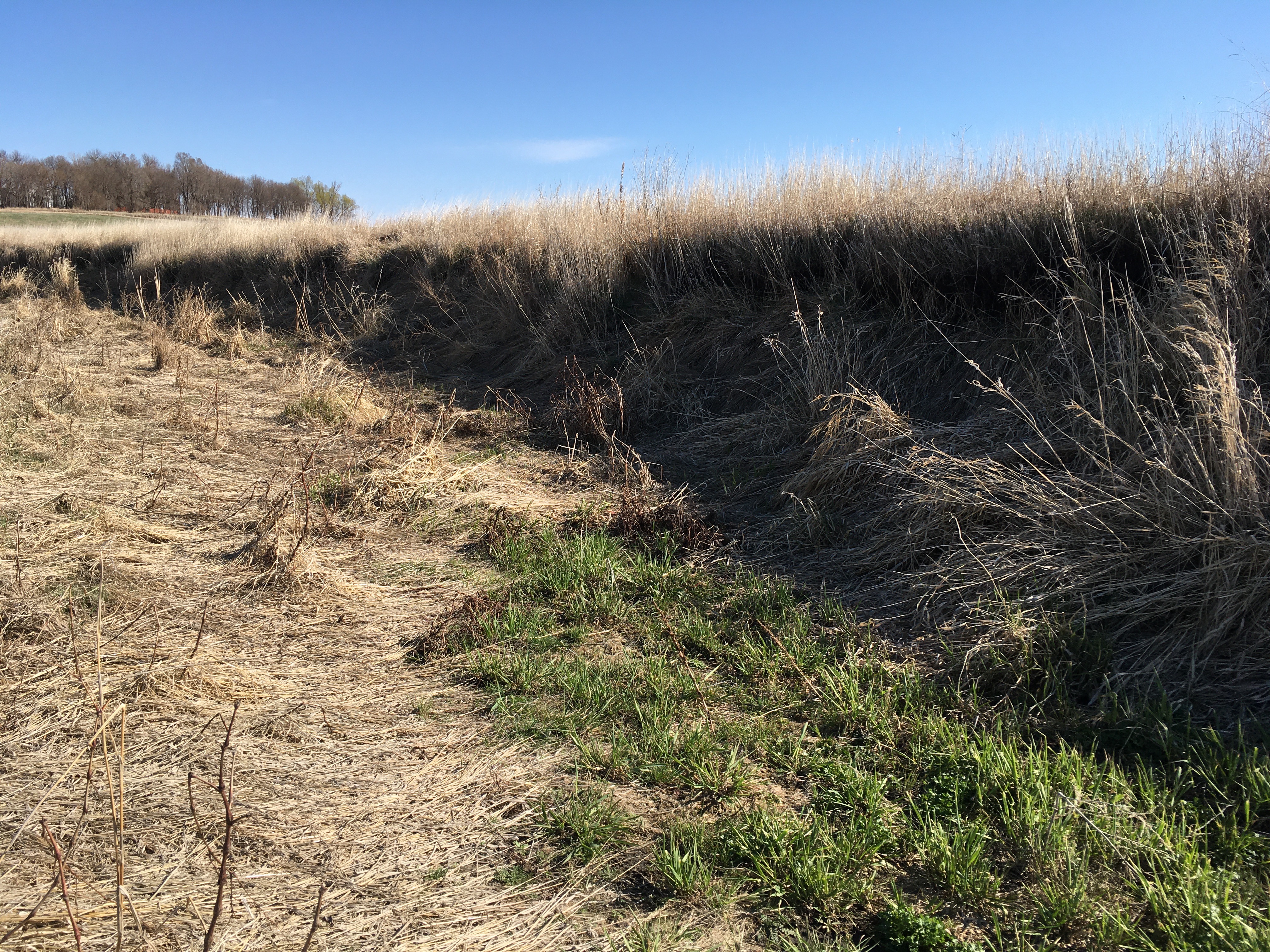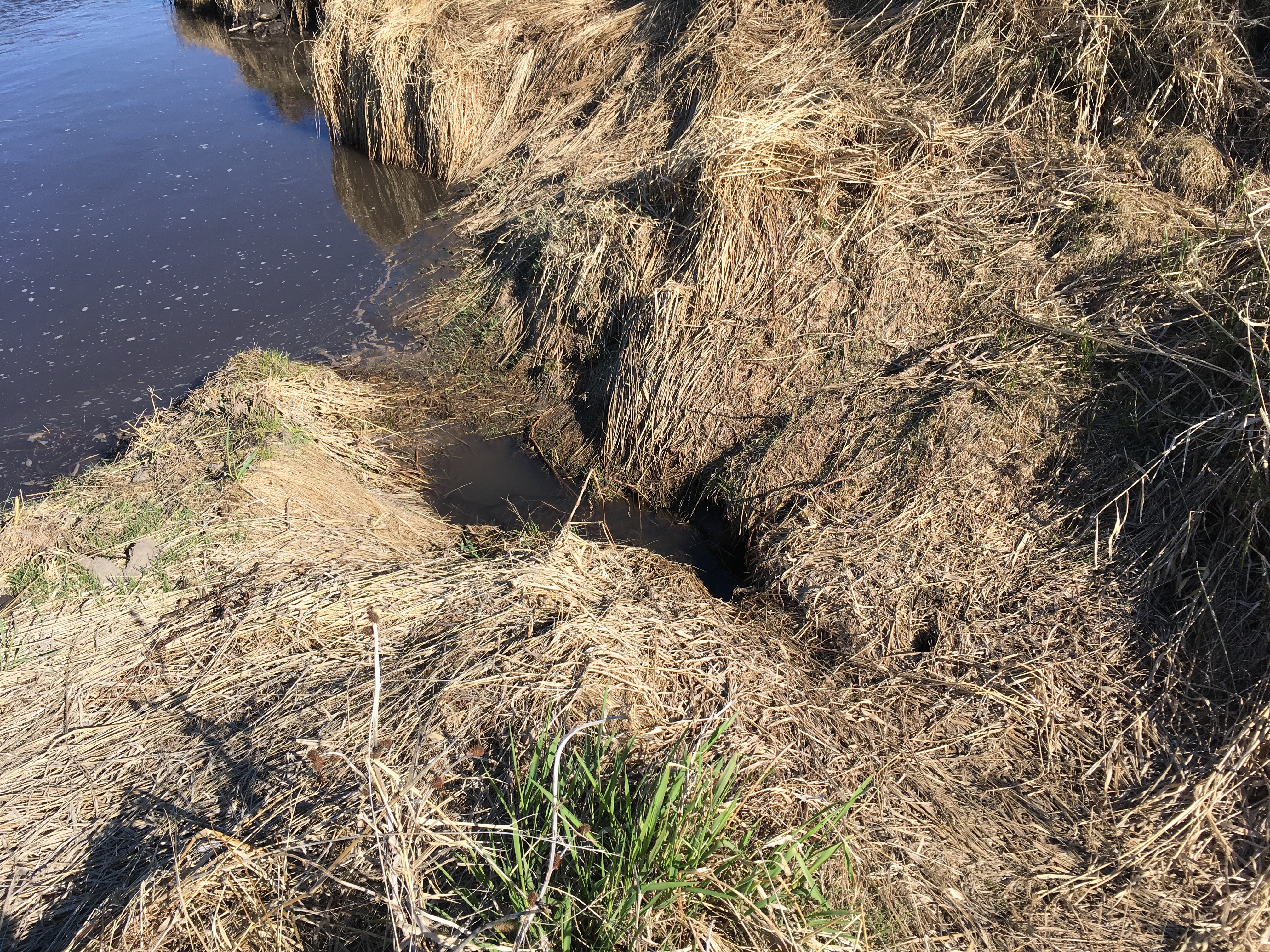 Originally the pond was connected to the main part of the Creek through a “tie channel” that let water in or out depending on the relative levels in the pond and main channel. But, not these days! Last year, grass totally took over and this season’s new green grass is already established where there once was water. Closer to the main channel, the “downstream plug” is completely grassed over, but it does have a small grove eroded when the water was slightly higher. However, like the upstream plug this pile of sediment at the downstream end of the oxbow has grown high enough to make it hard to get water in to or out of the abandoned meander. Once the vegetation is established, it acts as a baffle that slows down any channel water that comes in. That means the dirt carried by the water will be deposited and the oxbow will become even more isolated from the water in the main channel.