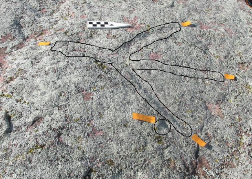 So, what does big bluestem have to do with Native American rock art? There’s a fairly common and distinctive motif that’s called a “turkey track”. The first image is an example on Pilot Rock near Cherokee in northwest Iowa (from a thesis by Quinn Black—complete reference available on request). This is fairly subtle rock art that is outlined for easy identification. But, there are also many examples at the petroglyph site near Jeffers in southwestern Minnesota. The image on the right is taken from a professional archaeology publication (again, the complete reference is available on request) describing a site in southeastern South Dakota. The intent is to demonstrate that the turkey track motif shown on the pottery fragment in the lower right, closely resembles the seed head of big bluestem grass. The “turkey track” motif in Native American rock art is very much like Dad’s “turkey foot” name for big bluestem.