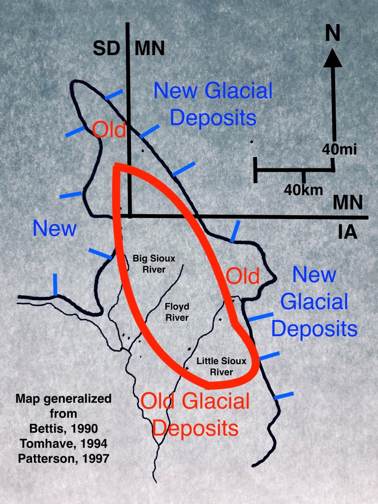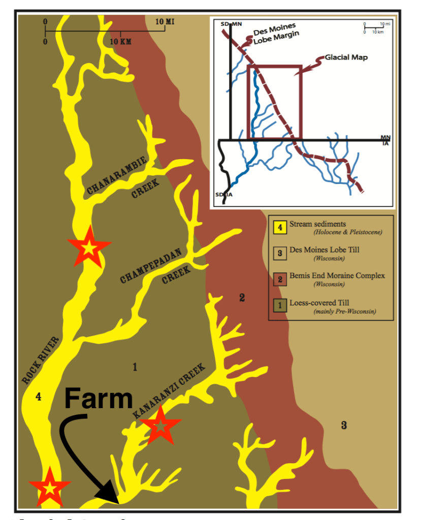 The Kanaranzi is only one of a series of streams that were used as travel corridors by Native Americans. Some of those travelers were from the tall grass prairie with big rivers to the south, but they were challenged by the Dakota who dominated the country of lakes and forests to the north. The three red stars mark places where settlers documented incidents between these travelers from the south and the Dakota people. A battle along the Rock River between the Dakota and Ponca people is described in an early history of Rock County. Farther south along the Rock River our homesteading great-grandparents encountered a Winnebago man who had trailed a wounded elk up from his reservation in the south; he was nervous about the Dakota catching him this far north. And the third incident was a battle between the Dakota and a group of southern people known as the Kansa. It’s described in a history of the nearby town of Ellsworth. That fight may have taken place a few miles north of the Farm and is memorialized in name of the Creek. “Kanaranzi” means “place where the Kansa were killed” in the Dakota language. These three encounters recorded in white history records are probably not the only ones that happened along the streams that flow out of the north and east. The Kanaranzi Creek and Rock River are not the only drainages that have memories of conflict along the corridors. All of these valleys (Unit 4) were originally formed when water coming off a melting glacier (the Des Moines lobe, Units 2 and 3) located just to the north and east, spilled out onto a broad plain of older glacial material (Unit 1).