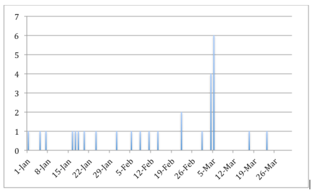 This bar graph shows our eagle sightings along the Creek since the first of the year. It was slow and steady from January 1 to March 1 because we had 16 sightings over the 60-day period. Then on March 4 and 5 there were 10 separate “sightings”! That included two times when there were four of them in the Eagle Tree…two adults and two immature ones without white heads and tails. Then there was a conspicuous dry spell with only a couple of sightings. That’s when the geese took over the pasture.