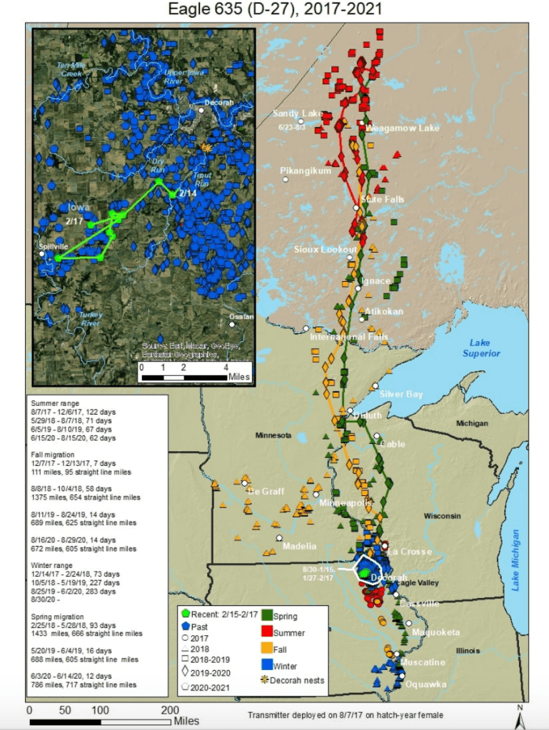 March must be good for eagles! There are many online “eagle cams” watching eggs and tracking specific individuals. Search Google for one near you. I had a friend recommend the Raptor Resource Project near Decorah, Iowa, and this route map is an example of their work. They’ve tracked birds for some pretty impressive distances along the Mississippi and points north. It shows that the banded birds like to follow big streams and that matches our eagles’ behavior along the much smaller Kanaranzi Creek.