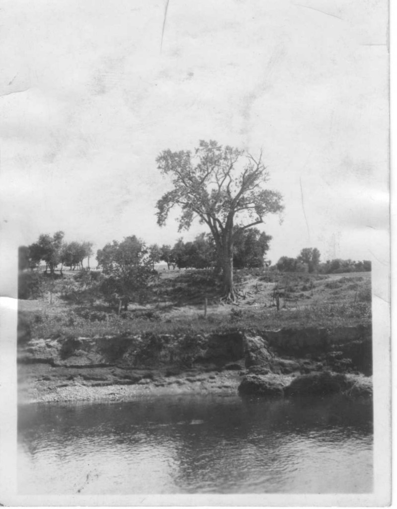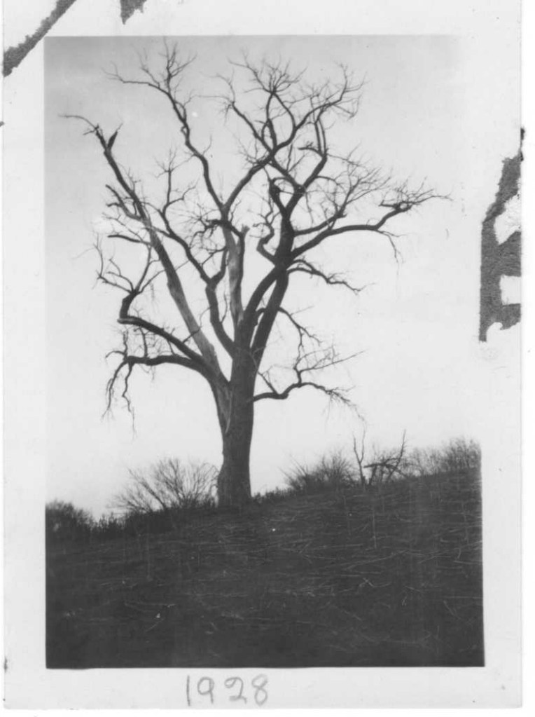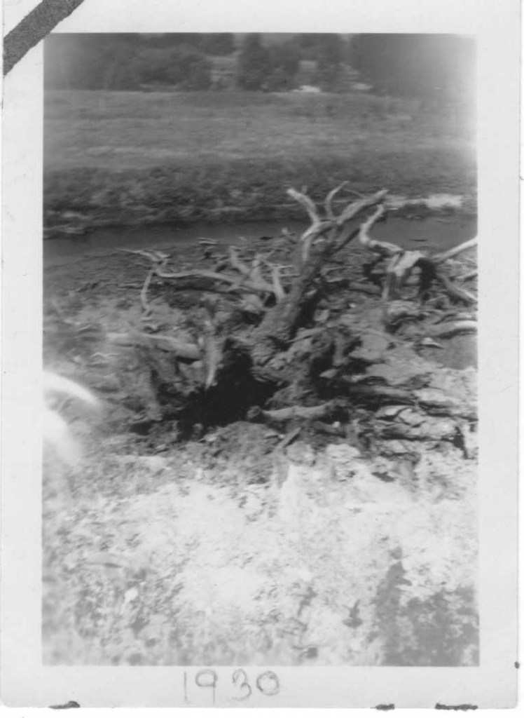 It was a big tree and it was apparently a “famous” tree, but in the end it died and fell into the Creek: “Split from top to bottom in its crash from the upper bank, the tree in death disclosed what was never suspected by anyone familiar with its history. Instead of being only one tree its wreck discloses it was a joint tree formed by the intergrowth of two separate seeds. Five feet in diameter at its base, it was supported by side roots measuring a foot across. Two years ago the passing of this monster tree was indicated when leaves and shoots failed to put forth and during these two years it has stood a grim caricature of its former greatness.” The still-standing dead tree is shown in the previous photo from 1928.