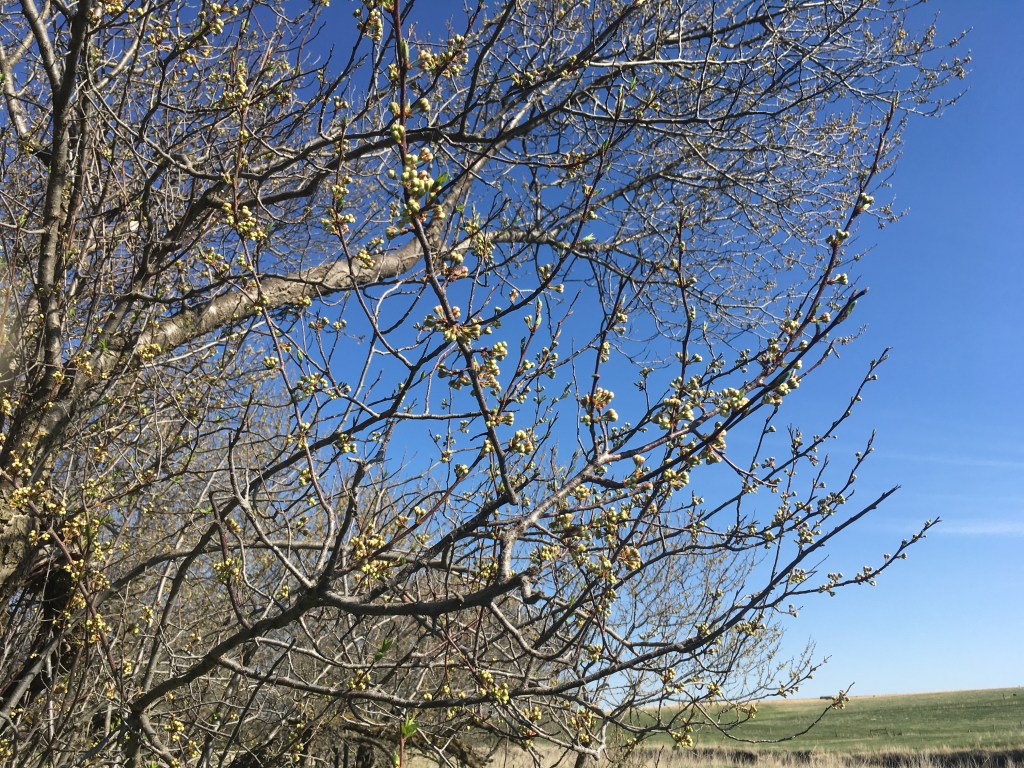 Last summer there was a blog post (you can find it here) about “mother trees” on the prairie that included a picture of this “family” with the mother and babies labeled. This spring the mom is in bloom and the little ones have new leaves. So the exclusion fence put up last year did help to protect them. The article posted last July speculated about age structure within the plum thickets and had pictures of the bigger, older trees in the middle and small young ones out at the margins. One of my friends, who had a long career in health care, raised a question about clusters of thickets being “related”. She suggested that some DNA testing would probably tell the story, but I don’t know how much that would cost.