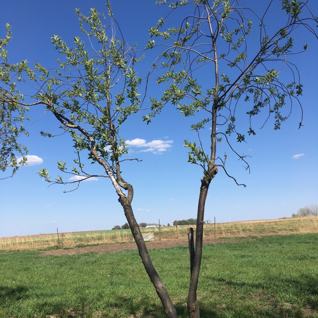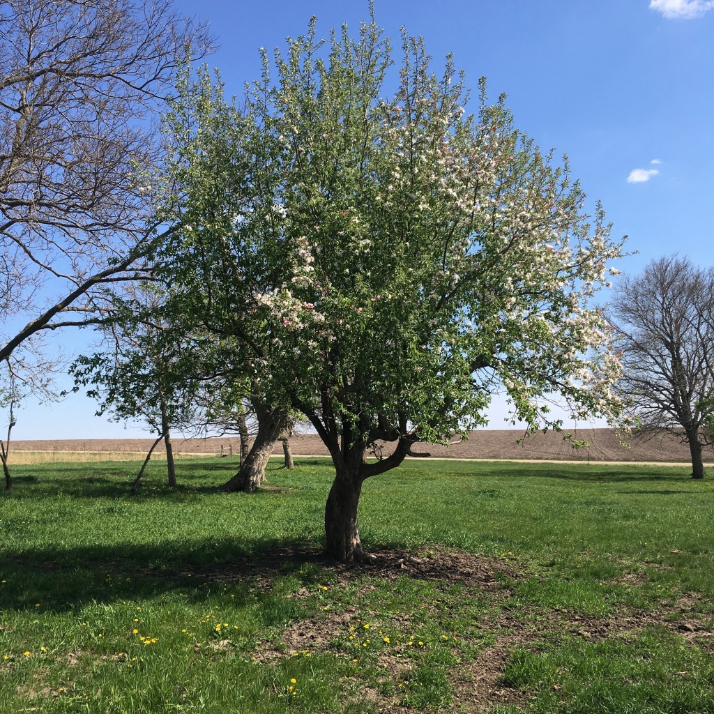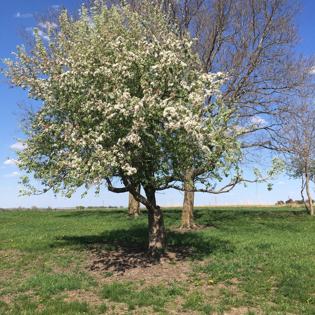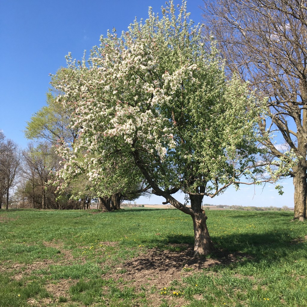 This is the only apple tree left in our orchard when it was in full bloom earlier this spring. In this long shot, the box elder tree to the right has plenty of leaves already, but the hackberry to the left still has not yet put out any. The small trees in the middle are chokecherries. The sole surviving apple tree looks pretty good in the closer photo on the right.