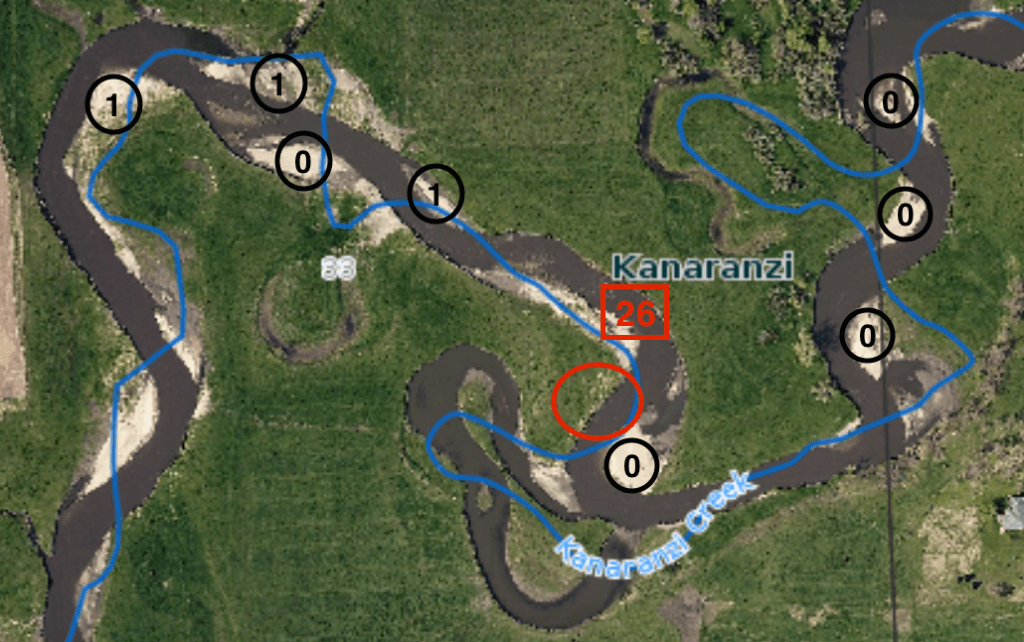 There are at least four aquifers along Kanaranzi Creek. Bedrock aquifers are deeply buried hundreds of feet below the land surface and information about them is limited. However, there are three distinctive water-bearing layers located at or very near the surface as shown in this sketch. The oldest is fractured gray clay with incorporated boulders that was deposited directly by glacial ice (“till”); it forms the hills and uplands along the Creek. The till is capped by wind-blown silt (“loess”) that also covers the intermediate age aquifer. That second aquifer is a sand and gravel layer deposited by glacial meltwater “(“outwash”); it underlies a flat terrace that stands just above the Creek. The third and youngest aquifer is a discontinuous layer of sand and gravel outwash that’s buried under stream sediments beneath the Creek’s floodplain.