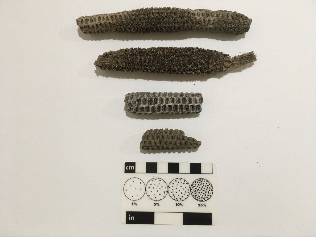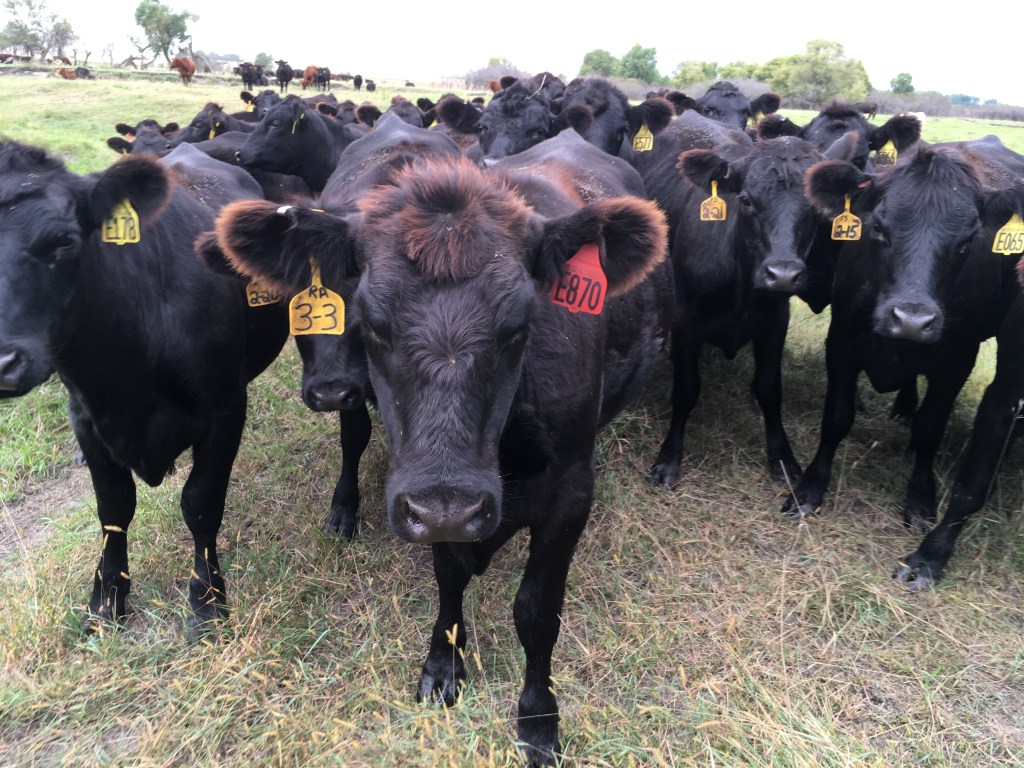 About thirty years ago, drainage tile was installed in the cropland and the water flows down into a wetland on the floodplain below the terrace. It’s sort of hard to see the tile water through all the brown grass in the left photo. But, the right photo shows the dark green plants that grow around the springs at the terrace edge are distinctively different than the vegetation in the paddocks on top of the flat terrace surface or than the crops on the adjacent field. The water from the drainage tile helps to sustain the wetland at the base of the hill.